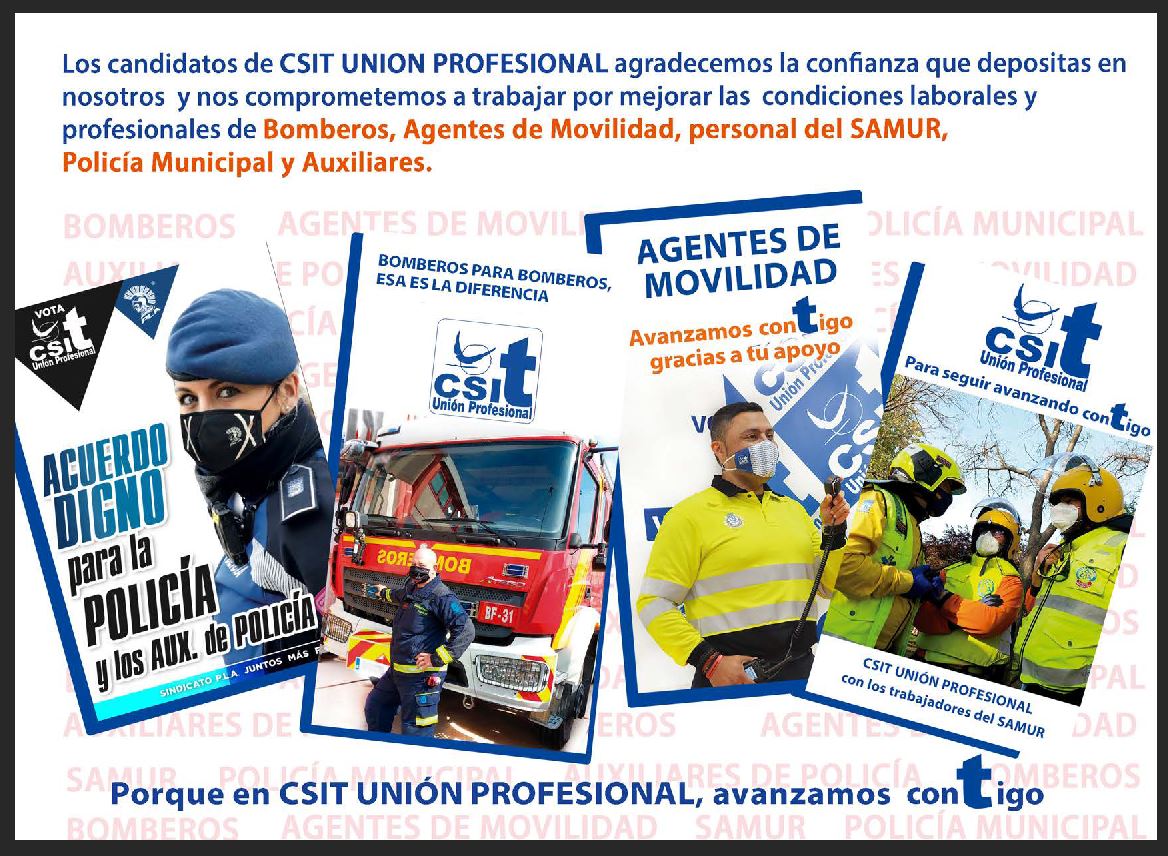 Los candidatos de CSIT UNIÓN PROFESIONAL se comprometen a seguir trabajando para mejorar las condiciones de la plantilla de Policía Municipal, Bomberos, Agentes de Movilidad y SAMUR del Ayuntamiento de Madrid, desde las respectivas Juntas de Personal. En este sentido, continuaremos exigiendo a la corporación que respete nuestros derechos como profesionales dentro de la plantilla municipal, así como proponiendo fórmulas que mejoren, día a día, el servicio que prestamos en connivencia con nuestra conciliación, desarrollo profesional y laboral.
