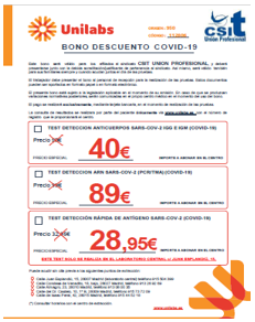 Podrás acceder a estos descuentos descargando el BONO ADJUNTOque se mostrará en el centro de extracción elegido, junto con la TARJETA DIGITAL CSIT UNIÓN PROFESIONAL (obtenla como afiliado aquí), donde abonarás la/s prueba/s.