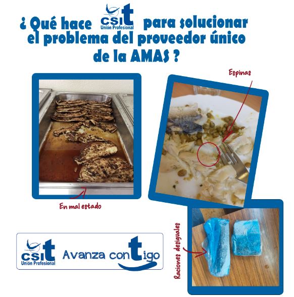 CSIT UNIÓN PROFESIONAL, a través de su presencia en Comités de Empresa y Secciones Sindicales en los centros, hemos trasladado estas deficiencias a los directores incluso nos hemos reunido con el Gerente de AMAS para exponerle detalladamente la ínfima calidad del producto, la escasa cantidad y el estado lamentable de las raciones asignadas, en la mayoría de ocasiones, con un retraso de la recepción de los pedidos que altera el funcionamiento y los servicios de los centros.