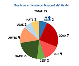 Según el cálculo de votos emitidos por el personal adscrito a la Junta de Personal de la Dirección Asistencial Oeste, CSIT UNIÓN PROFESIONAL ha obtenido 2 representantes.
