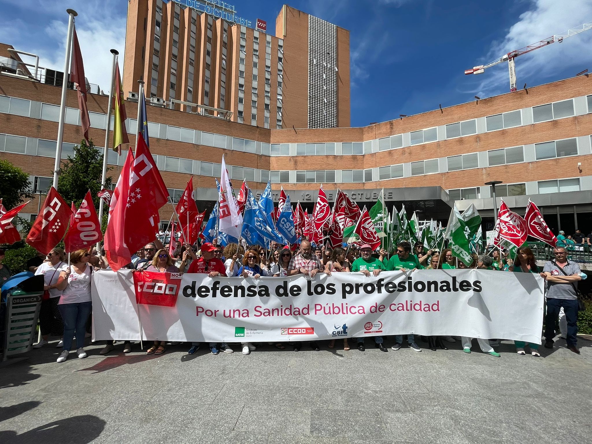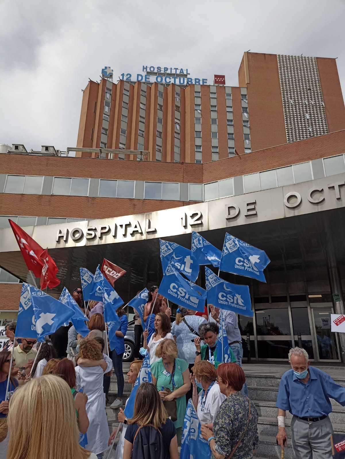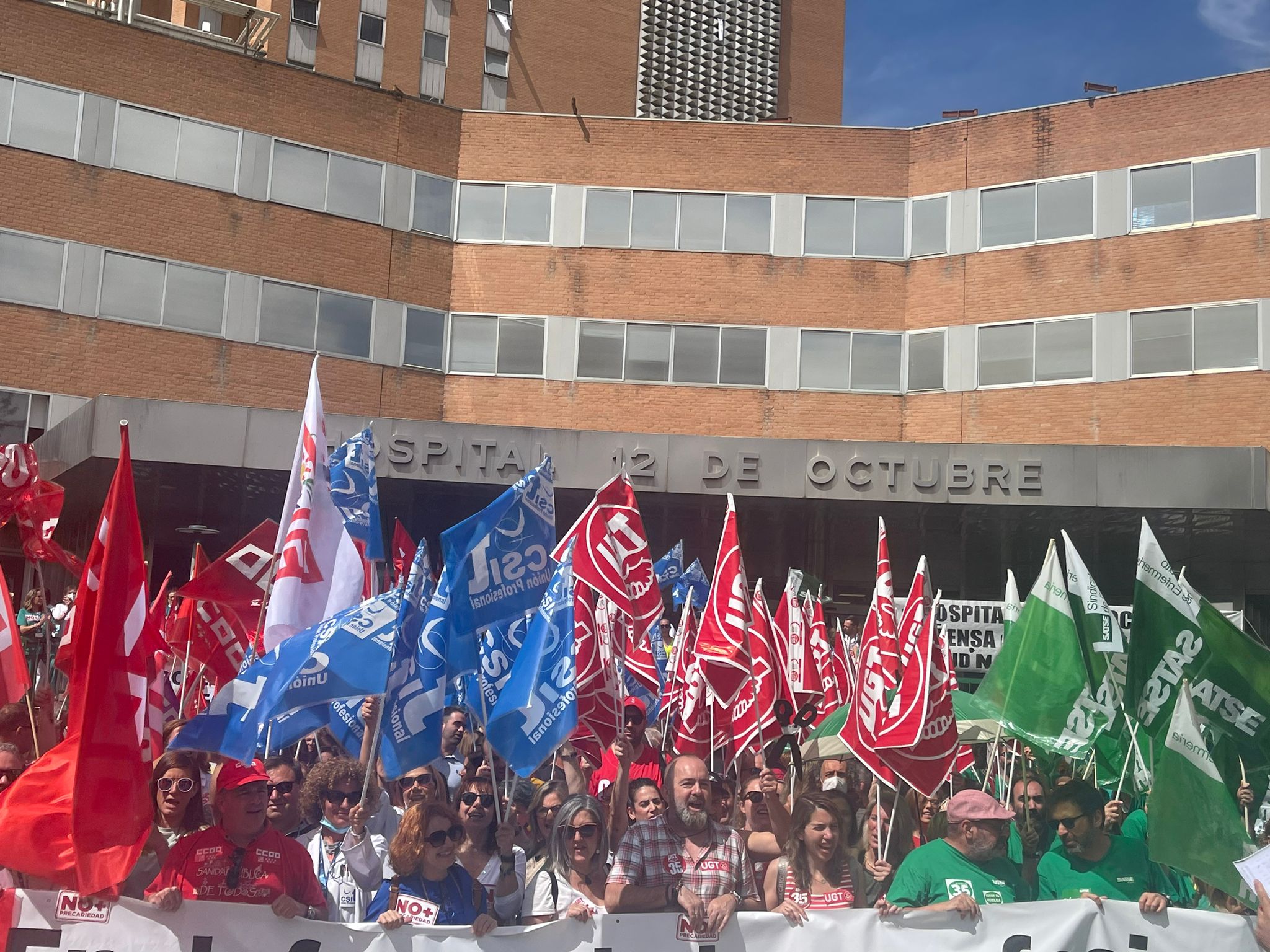 Ayer, a las 12:00 h, en las puertas del Hospital Doce de Octubre, CSIT UNIÓN PROFESIONAL, junto con otras tres organizaciones sindicales representativas de la Mesa Sectorial de Sanidad (SATSE, CCOO y UGT), participaban en la concentración para reivindicar la Jornada de 35 horas y otras mejoras laborales y retributivas en la Sanidad pública madrileña, coincidiendo con el segundo día de Huelga General en todo el SERMAS,
