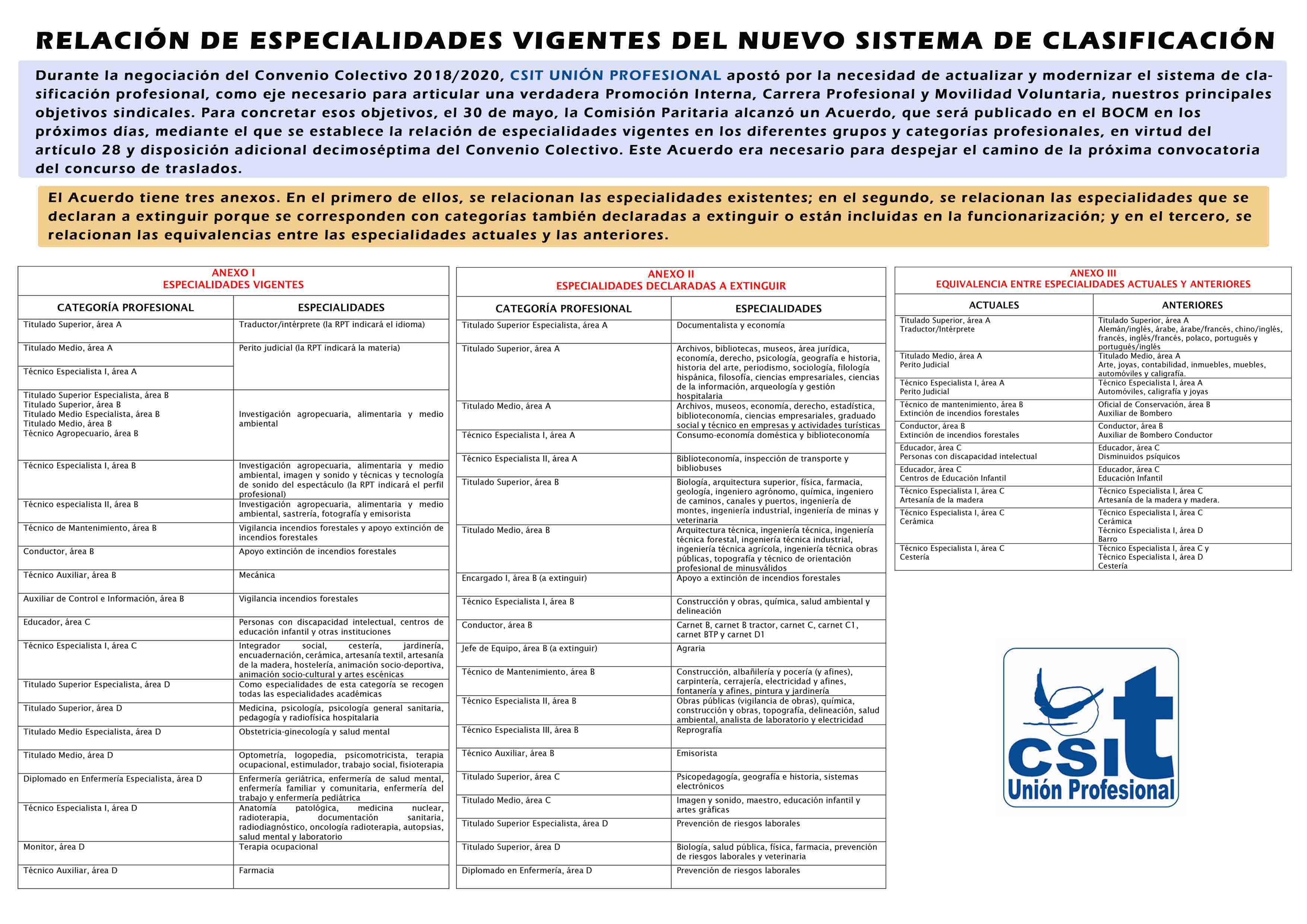 El Acuerdo tiene tres anexos: Relación especialidades existentes, Relación especialidades declaradas a extinguir y Relación equivalencias entre especialidades actuales y anteriores.