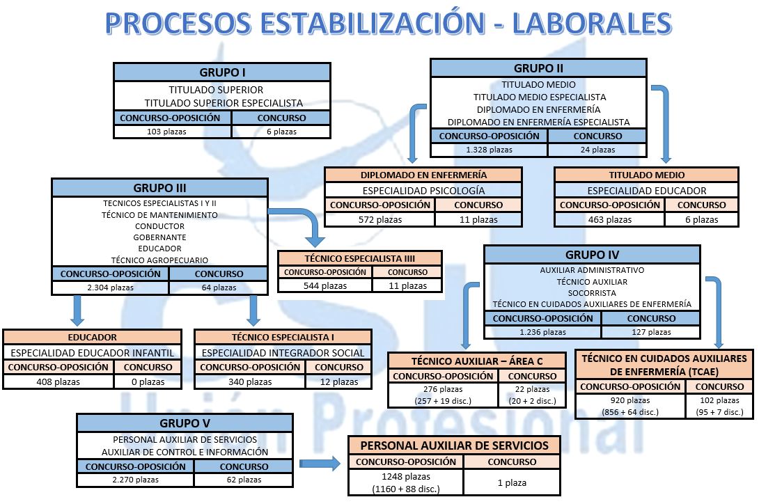 A continuación, en un breve cuadro resumen, os informamos de los datos globales por grupo profesional del personal laboral, desagregando las categorías profesionales con mayor número de plazas ofertadas, distinguiendo las de concurso y las de concurso-oposición: