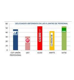 De un total de 312 delegados de Junta de Personal (personal funcionario y estatutario), CSIT UNIÓN PROFESIONAL ha obtenido un total de 47 en la 8 Juntas de Personal, es decir, en torno al 15,06% de la representatividad, alcanzando más de la mitad del porcentaje total de representación en la Junta de Personal de la Consejería de Sanidad (56,52%) con 13 delegados.