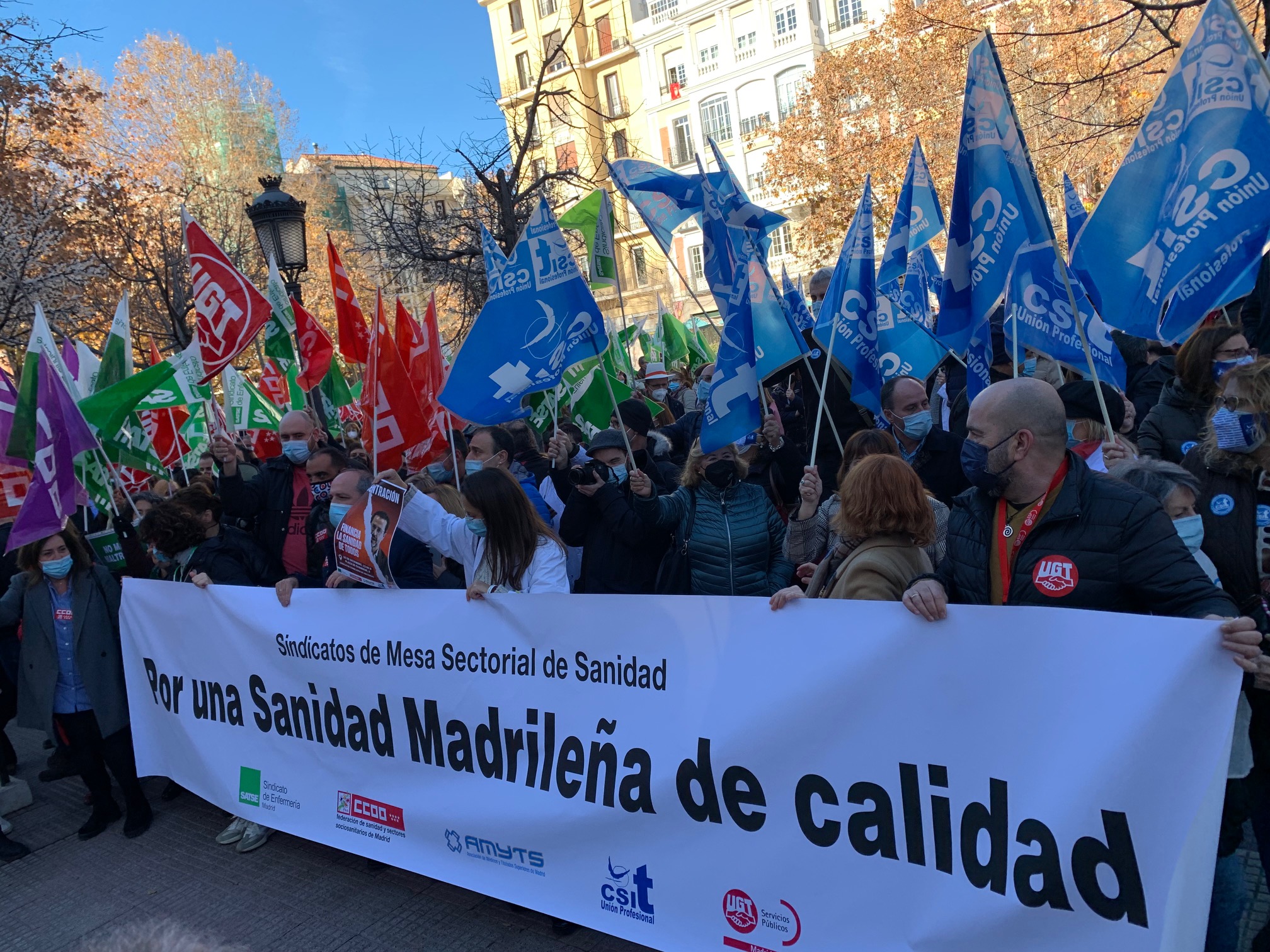 En la mañana de hoy, 15 de diciembre de 2022, CSIT UNIÓN PROFESIONAL, junto con el resto de organizaciones sindicales presentes en la Mesa de Sanidad de la Comunidad de Madrid (SATSE, CCOO, AMYTS y UGT), desplegaban la pancarta "Por una Sanidad pública de calidad" en la concentración de profesionales y pacientes frente a la Consejería de Economía, Hacienda y Empleo, durante la que se ha leído el siguiente comunicado:
