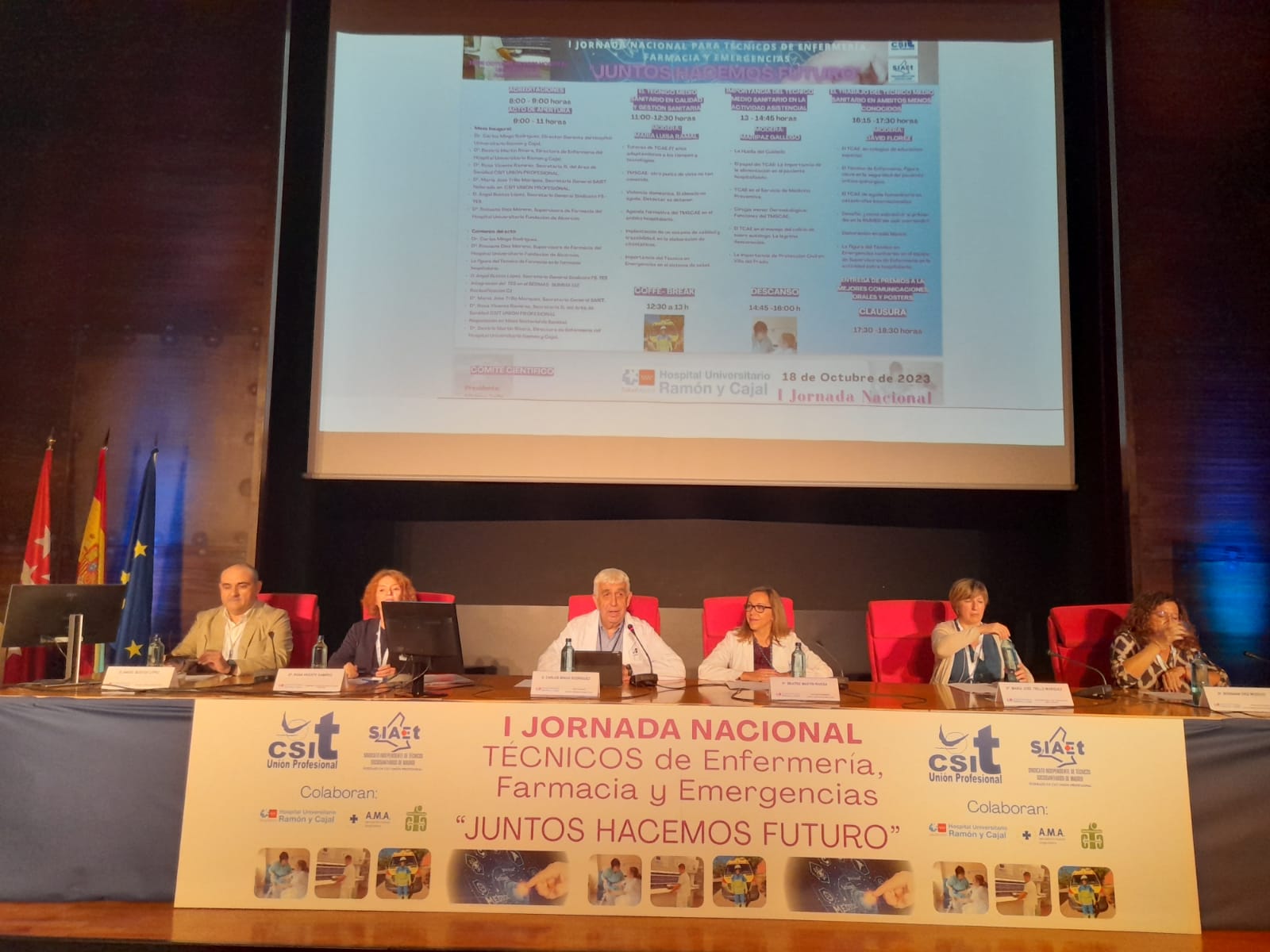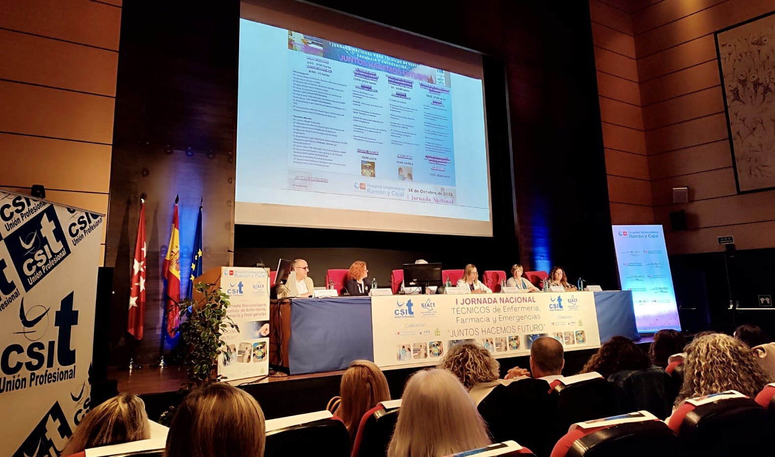 Ayer, 18 de octubre, a cargo del Sindicato Independiente de Técnicos Sanitarios y Sociosanitarios de Madrid, SIAET, federado en CSIT UNIÓN PROFESIONAL, se desarrollaba en el Salón de Actos del Hospital Universitario Ramón y Cajal, la I Jornada Nacional para Técnicos de Enfermería, Farmacia y Emergencias, “Juntos hacemos futuro”, que fue inaugurada por el Director Gerente del hospital anfitrión, Carlos Mingo, con la intervención posterior de su Directora de Enfermería, Beatriz Martín. El acto de apertura de esta Jornada pionera lo realizaba la Secretaria General de SIAET, María José Trillo, con las intervenciones de Rosa Vicente, Secretaria del Área de Sanidad de CSIT UNIÓN PROFESIONAL; Ángel Bustos, Secretario General de FSTESSUMMA112 y Rossana Díez, Supervisora de Farmacia del Hospital U. Fundación Alcorcón. La jornada se dividió en varios bloques para tratar la figura del Técnico Medio Sanitario en calidad y gestión sanitaria, su importancia en la actividad asistencial, su trabajo en ámbitos menos conocidos y finalmente, la entrega de premios a las mejores comunicaciones orales y pósteres que precedía a la clausura.