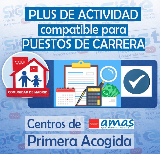 Esta iniciativa ha sido impulsada a través del Sindicato de Técnicos y Gestores, SIGTE, federado en CSIT UNIÓN PROFESIONAL, mediante nuestros representantes del Área de Servicios Sociales y del Área de Administración Autonómica, en la Comisión Paritaria del 19 de febrero, en la que solicitaban formalmente la aplicación del acuerdo (Acta 6/2020, ampliado por el 8/2025), para que se retribuya el Plus de Actividad, a los Puestos de Carrera adscritos a la AMAS en dichos centros. Tras nuestra reivindicación sostenida en la Comisión Paritaria, la Administración ha confirmado la NO INCOMPATIBILIDAD del Plus de Actividad con los Puestos de Carrera.
