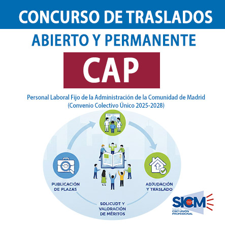 El Concurso Abierto y Permanente (CAP) es el sistema ordinario para cubrir las vacantes de puestos de trabajo del personal laboral fijo de la Comunidad de Madrid. Su finalidad es que las vacantes se cubran primero mediante movilidad voluntaria del personal fijo, y solo si no se cubren así, se pueda acudir a contratación temporal o nuevo ingreso Esta guía es información resumida de cada apartado de las Bases Generales del CAP que ofrece CSIT UNIÓN PROFESIONAL, primer sindicato en representatividad entre el Personal Laboral y Funcionario de la Comunidad de Madrid.
