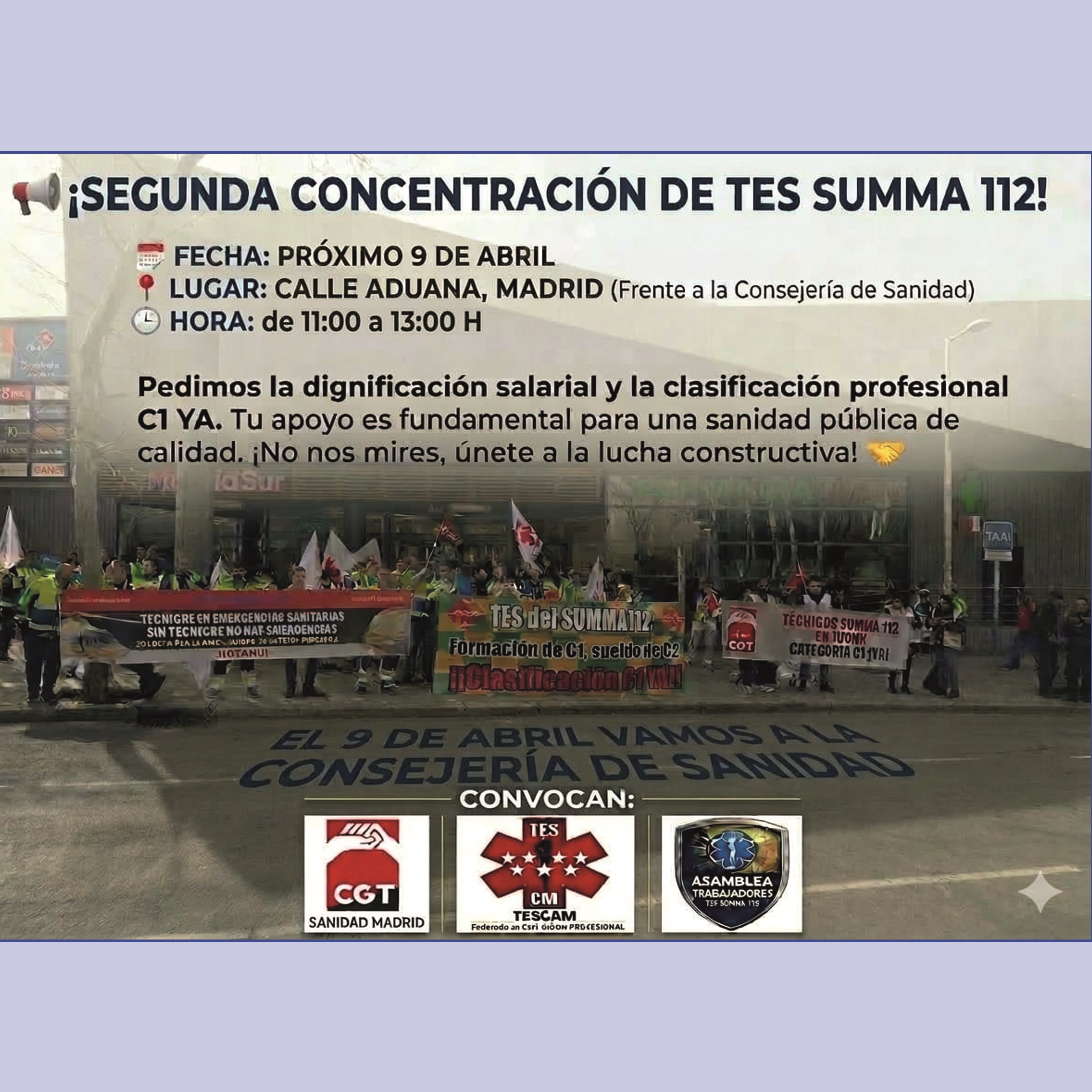 La movilización del 9 de abril pretende dar visibilidad a una reivindicación que TESCM viene defendiendo de forma sostenida: la necesidad de adecuar tanto la clasificación profesional como las retribuciones de los Técnicos en Emergencias Sanitarias del SUMMA 112 a la titulación exigida, a las funciones reales del puesto y a la evolución que ha experimentado esta categoría dentro del sistema sanitario madrileño.