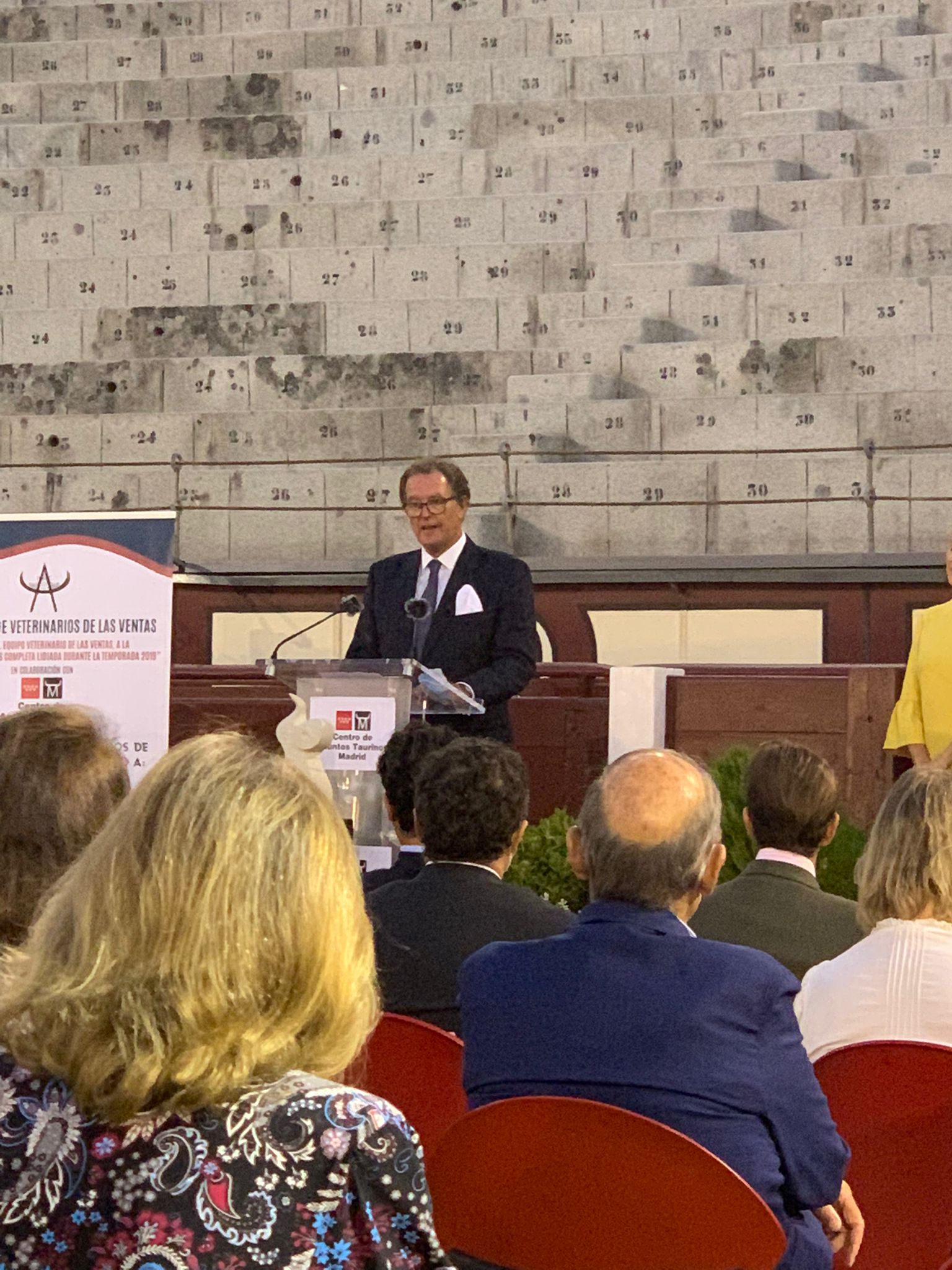 El Director del CAT de la Comunidad de Madrid, agradecía la iniciativa de los veterinarios de la plaza de seguir apoyando a los ganaderos por criar al protagonista del espectáculo de la tauromaquia. Por su parte, el Presidente de la Asociación de Veterinarios de Las Ventas, destacaba el excelente trabajo realizado por el premiado y el Secretario de la Asociación de Veterinarios leía el acta por el que se proclamaba el galardón. Procedió a hacer la entrega del premio, una escultura de D. David Vaamonde, el matador de toros y Premio Nacional de Tauromaquia, D. Juan José Padilla.