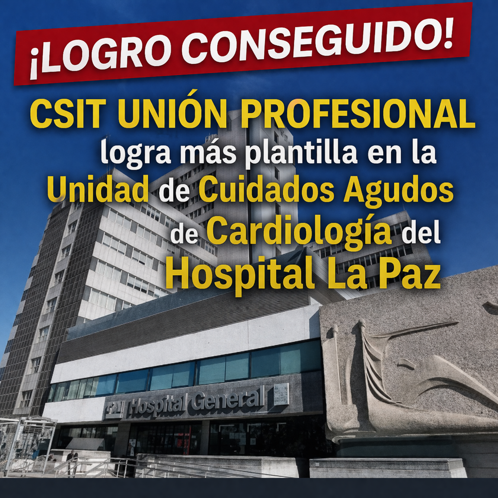 La Sección Sindical de CSIT UNIÓN PROFESIONAL en el Hospital Universitario La Paz logra, tras años reclamando más personal para esta unidad, que se materialice una medida imprescindible: el aumento estable de plantilla en la Unidad de Cuidados Agudos de Cardiología, una mejora que repercutirá directamente en la calidad asistencial y en las condiciones laborales de la plantilla.