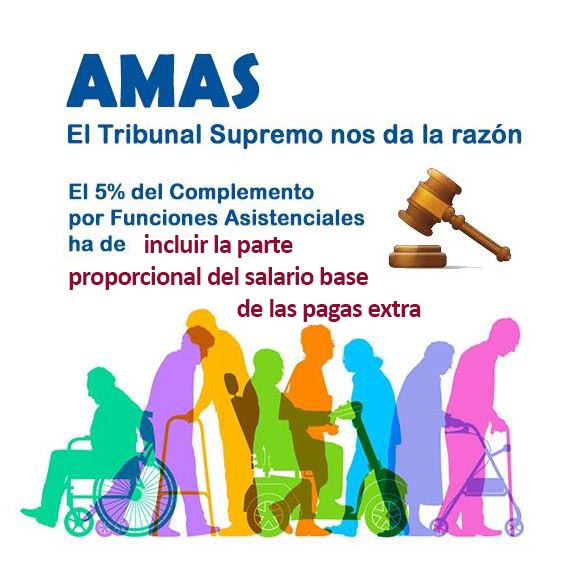 Ahora, y tras todas las actuaciones judiciales pertinentemente promovidas por CSIT UNIÓN PROFESIONAL, el Tribunal Supremo, en sentencia firme, por fin ha hecho justicia reconociendo el derecho a que el 5% del complemento por funciones asistenciales que perciben todos los trabajadores fijos y temporales de las categorías profesionales del área de actividad D, Terapeutas Ocupacionales, Fisioterapeutas, DUEs, TCAEs, Monitores, etc., así como los Técnicos Auxiliares del área C, que prestan sus servicios en los centros de trabajo de la AMAS, se aplique sobre la totalidad de sus retribuciones, esto es, sobre el salario base, y por tanto, incluyendo la parte proporcional correspondiente a las pagas extraordinarias.