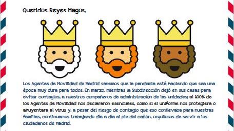 El Sindicato de Agentes de Movilidad, S.P.A.M, federado en CSIT UNIÓN PROFESIONAL y mayoritario entre la plantilla de este colectivo en el Ayuntamiento de Madrid, ha escrito carta a Sus Majestades los Reyes Magos para pedirles que la corporación municipal les abone a los 650 agentes del cuerpo, las cantidades correspondientes a conceptos de productividad de los años 2018, 2019 y 2020, así como la puntualidad en el abono de las horas extra que vienen percibiendo con 6 meses de retraso.