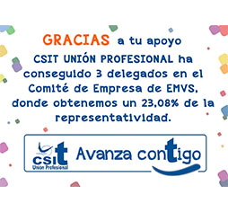 GRACIAS a tu apoyo, CSIT UNIÓN PROFESIONAL ha conseguido 3 delegados en el Comité de Empresa de EMVS, donde obtenemos un 23,08% de la representatividad.
