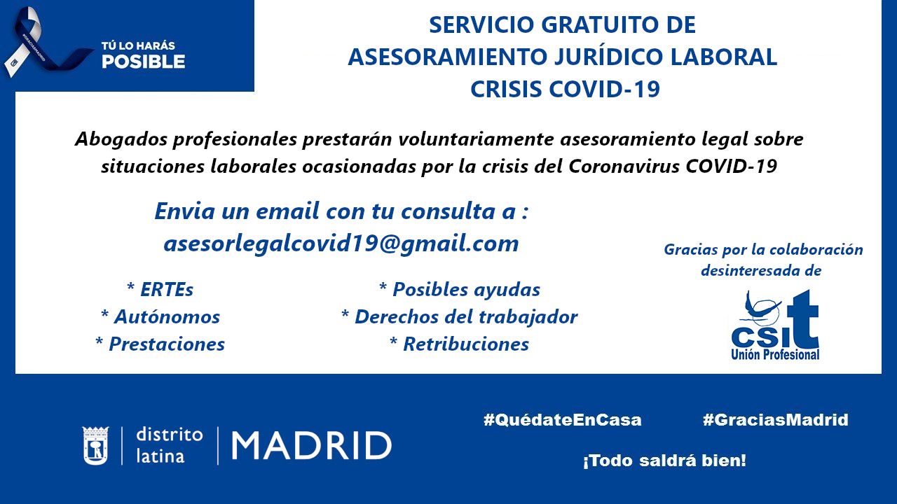 Mediante este Servicio que será gratuito mientras dure el estado de alarma, ayudamos a que los vecinos de los distritos de Latina y Hortaleza puedan obtener respuesta profesional ante las dudas que surgen en estos momentos de crisis.