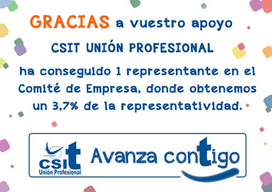 CSIT UNIÓN PROFESIONAL ha conseguido 1 representante en el Comité de Empresa, donde obtenemos un 3,7% de la representatividad.