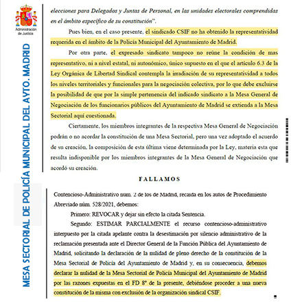 A pesar de que el Ayuntamiento de Madrid desestimó el recurso contencioso-administrativo que CSIT UNIÓN PROFESIONAL interpuso ante la Dirección General de la Función Pública del Ayuntamiento de Madrid por considerar indebida la participación del sindicato CSIF en la Mesa Sectorial de Policía del Ayuntamiento de Madrid,  la sentencia del TSJMda la razón a CSIT UNIÓN PROFESIONAL declarando nula la constitución de la Mesa al no haber obtenido una representatividad del 10% en el ámbito funcional y territorial correspondiente y no reunir la condición de sindicato más representativo, tal y como desde el principio ha mantenido CSIT UNIÓN PROFESIONAL.
