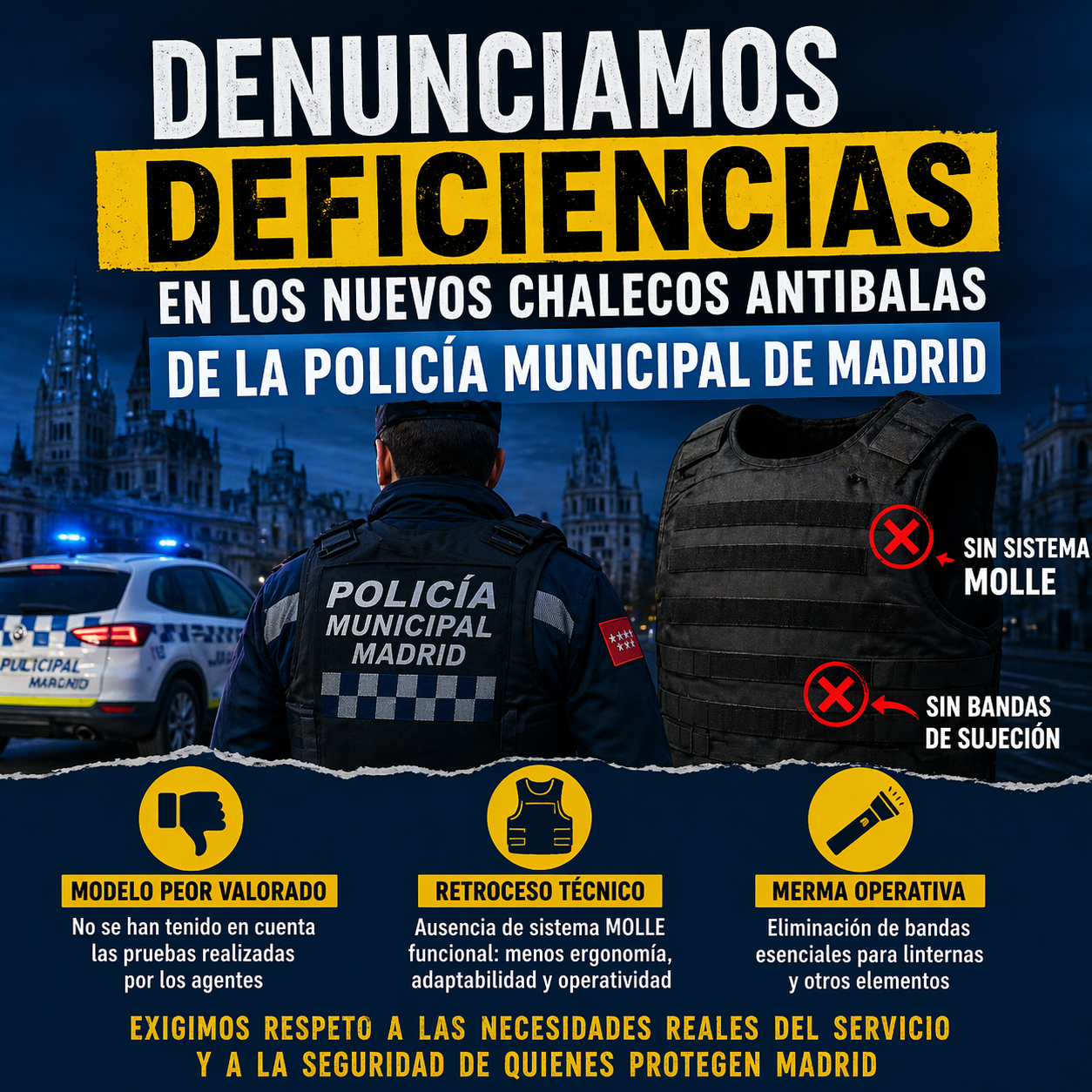 Desde CSIT UNIÓN PROFESIONAL y el Sindicato de Policía Local Asociada (P.L.A.) hemos remitido un escrito a la Coordinación de Seguridad y Emergencias y a la Dirección General de la Policía Municipal de Madrid para denunciar las deficiencias detectadas en la nueva dotación de chalecos antibalas y sus fundas.