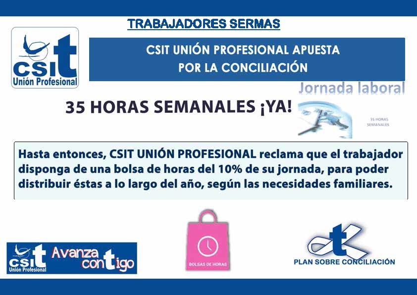 Hasta que la Administración de la Comunidad de Madrid no acceda a negociar con los representantes de los trabajadores la aplicación de la jornada laboral de 35 horas de promedio semanal, CSIT UNIÓN PROFESIONAL reclama al SERMAS que habilite para sus trabajadores, una bolsa de horas para favorecer su conciliación. Cada trabajador dispondría de una bolsa del 10% de su jornada, para poder distribuir éstas a lo largo del año, según sus necesidades familiares.