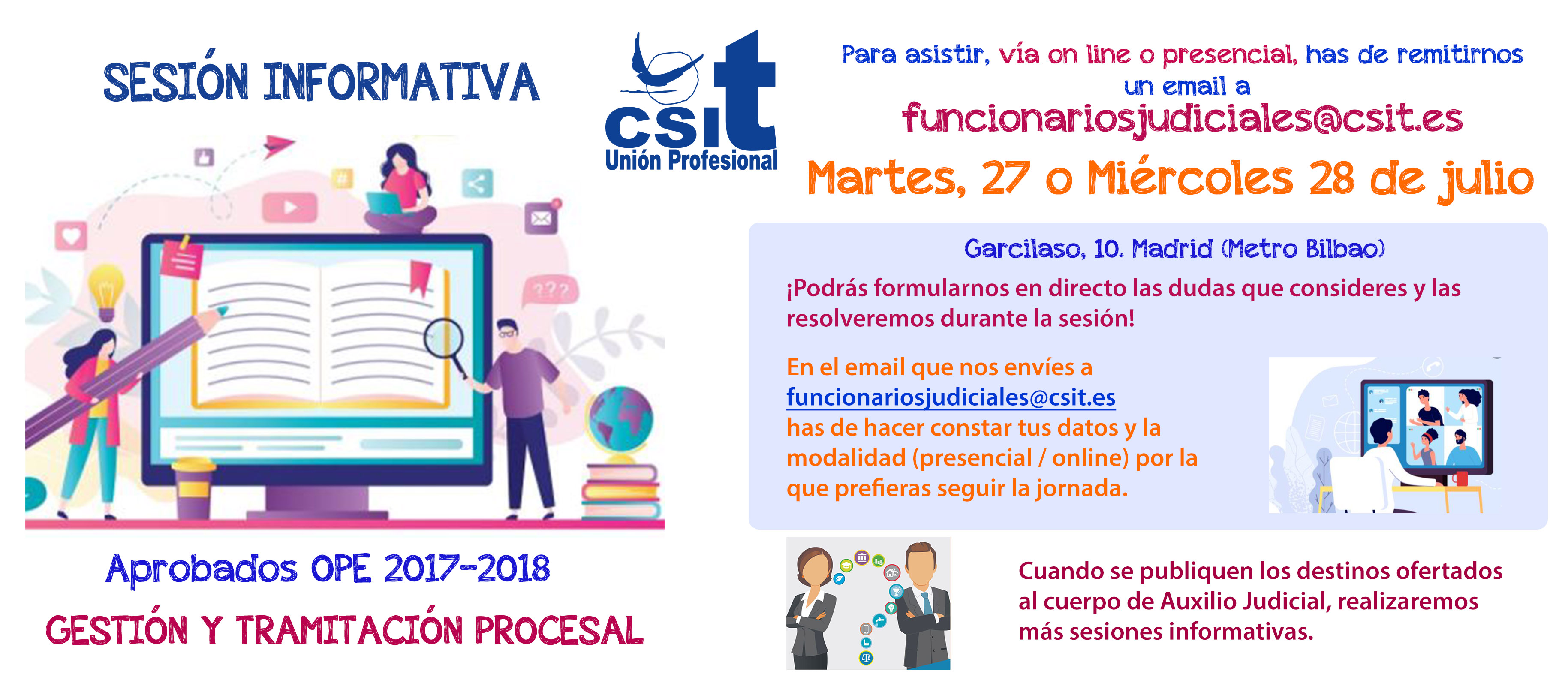 - Para confirmar asistencia, indicando día de preferencia y modalidad (presencial u online), deberás remitir un correo electrónico con tu nombre, apellidos y DNI al siguiente email: funcionariosjudiciales@csit.es.