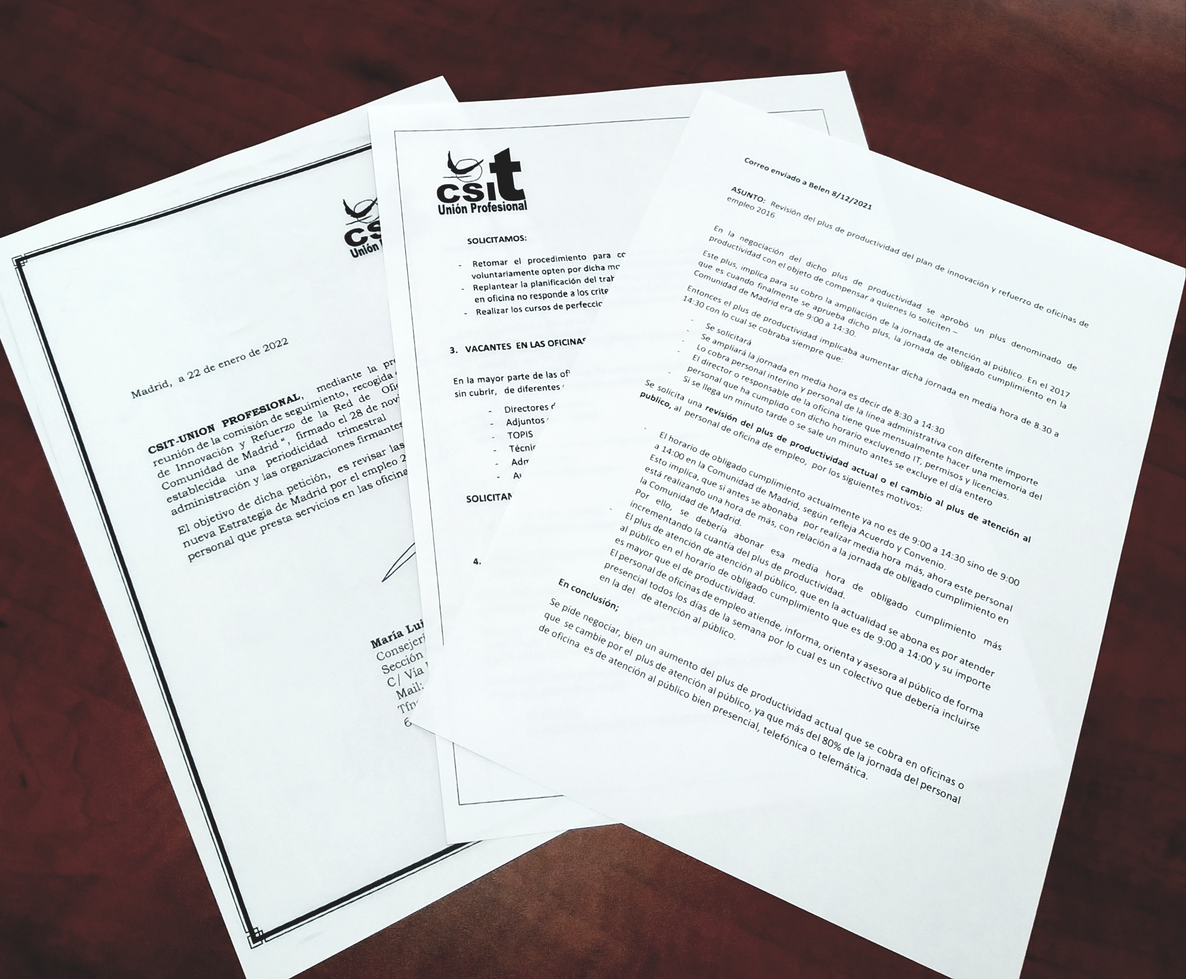 El horario de obligado cumplimiento ya no es de 9:00 a 14:30 horas, sino de 9:00 a 14:00, según establece el Acuerdo y Convenio para personal funcionario y laboral de la CM. Esto implica, que, si antes se abonaba por realizar media hora más, ahora estos trabajadores están realizando una hora de más, con relación a la jornada de obligado cumplimiento, pero no perciben ningún incremento del Plus de Productividad como remuneración de este tiempo de trabajo extra. Desde CSIT UNIÓN PROFESIONAL reclamamos un aumento del Plus de Productividad actual o bien la modificación de este adaptándolo al Plus de Atención al Público, ya que más del 80% de la jornada del personal de Oficina es de Atención al Público: ya sea presencial, telefónica o telemática.