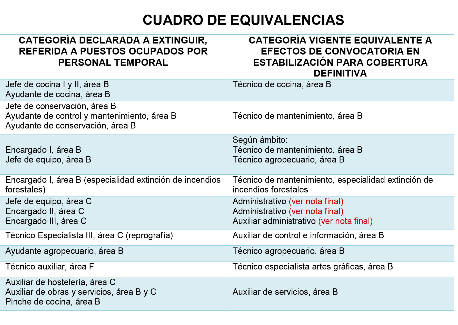 *Nota: Estas categorías profesionales no aparecerán en la tabla de equivalencias de la resolución acordada. Su equivalencia es con categorías del área administrativa, por tanto, aparecerán en el catálogo de puestos susceptibles de funcionarizar correspondientes a las categorías declaradas a extinguir. Su funcionarización será: puestos de personal funcionario, grupo C1 y nivel de complemento de destino 16, para jefe de equipo y encargado II y; grupo C2 y nivel de complemento de destino 14, para encargado III. Recordamos que la funcionarización es voluntaria.