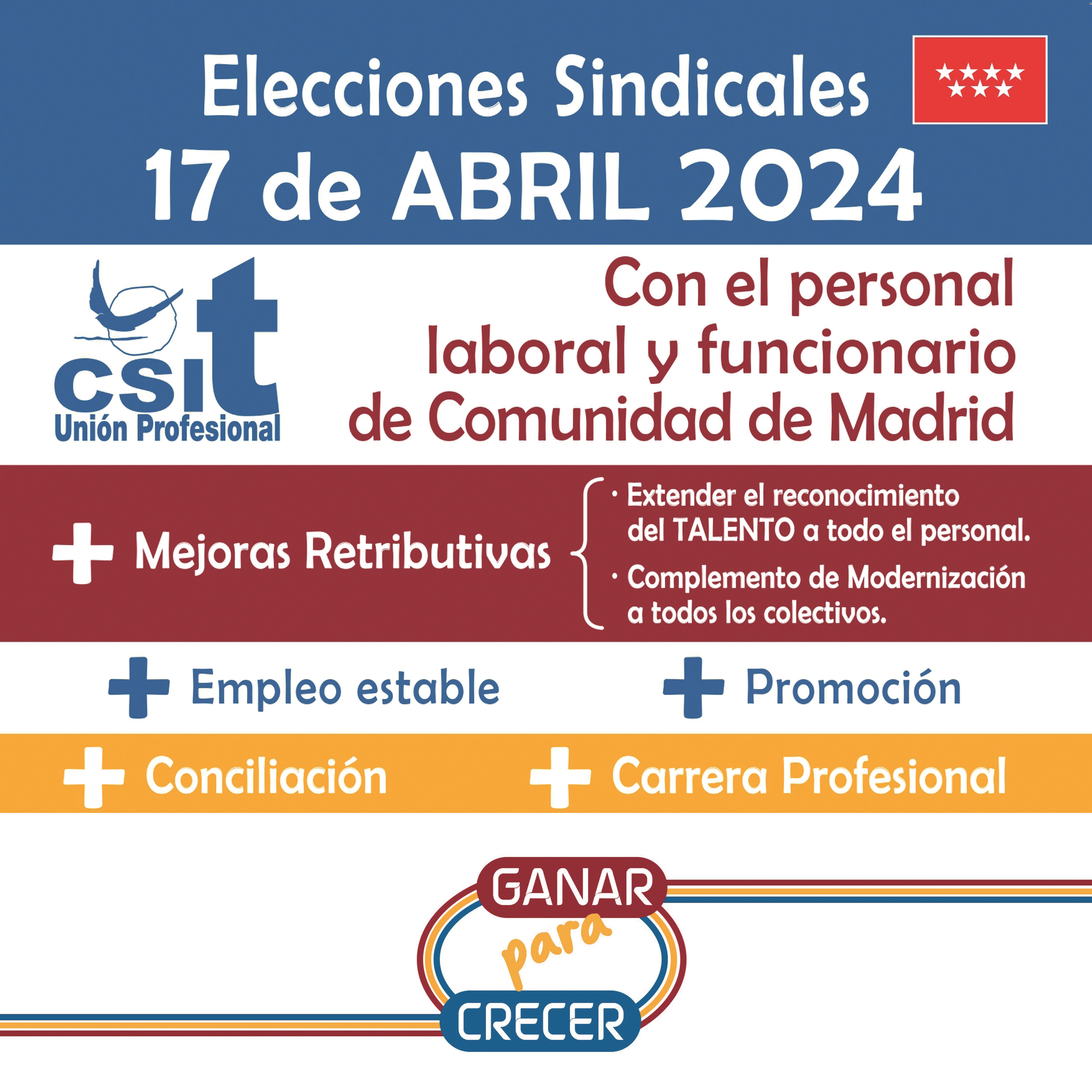 El miércoles, 17 de abril, se elegirán a los representantes del personal laboral y funcionario de la Comunidad de Madrid. Desde CSIT UNIÓN PROFESIONAL, te recordamos la importancia de acudir a las urnas y depositar tu voto.