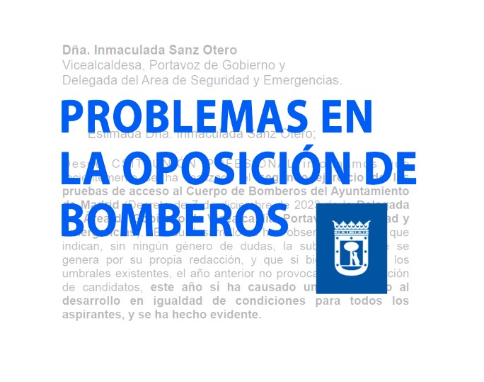 En vista de los hechos observados durante el desarrollo del segundo ejercicio de las pruebas de acceso al Cuerpo de Bomberos del Ayuntamiento de Madrid (Decreto de 7 de diciembre de 2023 de la Delegado del Área de Gobierno y Vicealcaldía, Portavoz, Seguridad y Emergencias), que confirman la subjetividad que se genera por su redacción, CSIT UNIÓN PROFESIONAL ha remitido carta a la Vicealcaldesa, Portavoz de Gobierno y Delegada del Área de Seguridad y Emergencias, solicitándole, como firmante de las bases de dicho ejercicio, la anulación de la parte del texto en la que se ha detectado error de redacción. Igualmente, hemos pedido la paralización de este proceso, a la espera de que dicho texto sea corregido para futuras convocatorias.