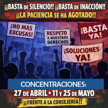 Por ello, insistimos en informaros de que seguiremos impulsando movilizaciones, concentraciones y acciones de protesta firmes hasta que la Consejería responda, escuche y solucione con acuerdos concretos.