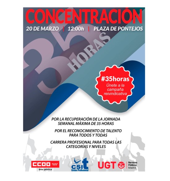 CCOO, CSIT UNIÓN PROFESIONAL y UGT convocamos concentración de empleados del sector público de la Administración de la Comunidad de Madrid, para reivindicar la recuperación de la jornada semanal de 35 horas.