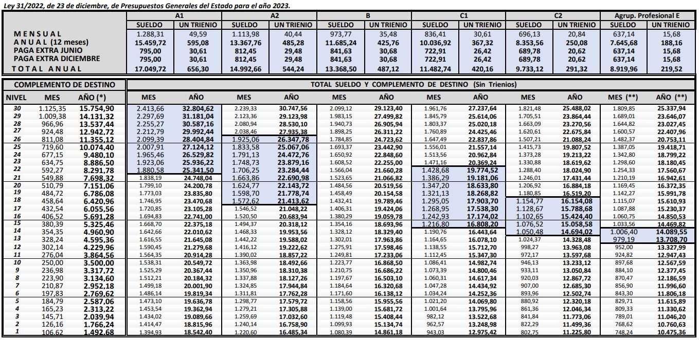 (**) Se mantienen a título personal las cuantías del C.D. del grupo E/Agrupaciones profesionales del EBEP (Art. 23 Uno G) de la LPGE 2023). No obstante, el C.D. del personal de este grupo que ingresó a partir de 31/5/2010 es el mismo que figura en la primera columna.