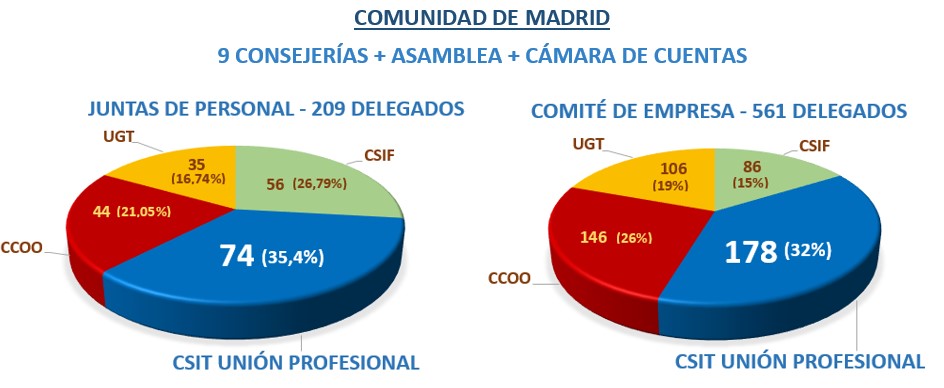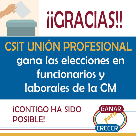 CSIT UNIÓN PROFESIONAL ha ganado las elecciones celebradas el 17 de abril, alzándose como sindicato mayoritario tanto entre el Personal Laboral, como entre el Funcionario de la Administración de la Comunidad de Madrid. CSIT UNIÓN PROFESIONAL logra una incontestable mayoría con más del 30% de la representatividad, después de 40 años de hegemonía de CCOO en este ámbito.