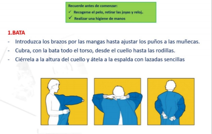 ¿Cómo son? Son batas de manga larga, fabricadas en tejido impermeable, para impedir que penetre cualquier salpicadura). Proporcionan mayor sensación de ligereza, reduciendo la fatiga tras su uso continuado y permiten el ajuste en el cuello y la cintura para una mayor adaptabilidad individual. Están diseñadas para facilitar su puesta y retirada, lo que implica minimizar el riesgo de contacto con una zona de la bata contaminada por salpicaduras producidas durante la atención al paciente.
