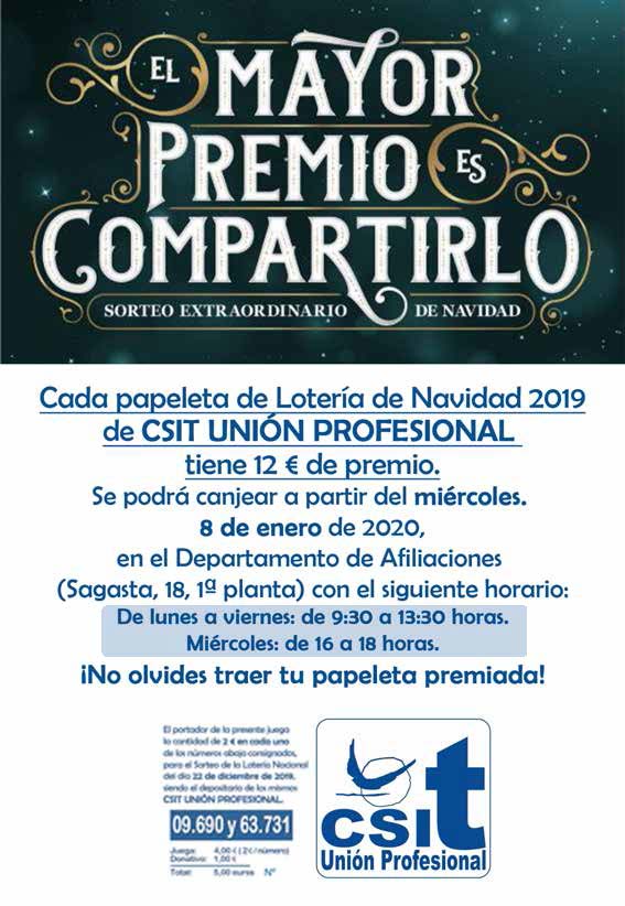 Premiadas con 12 euros las papeletas de la Lotería de Navidad 2019 de CSIT UNIÓN PROFESIONAL