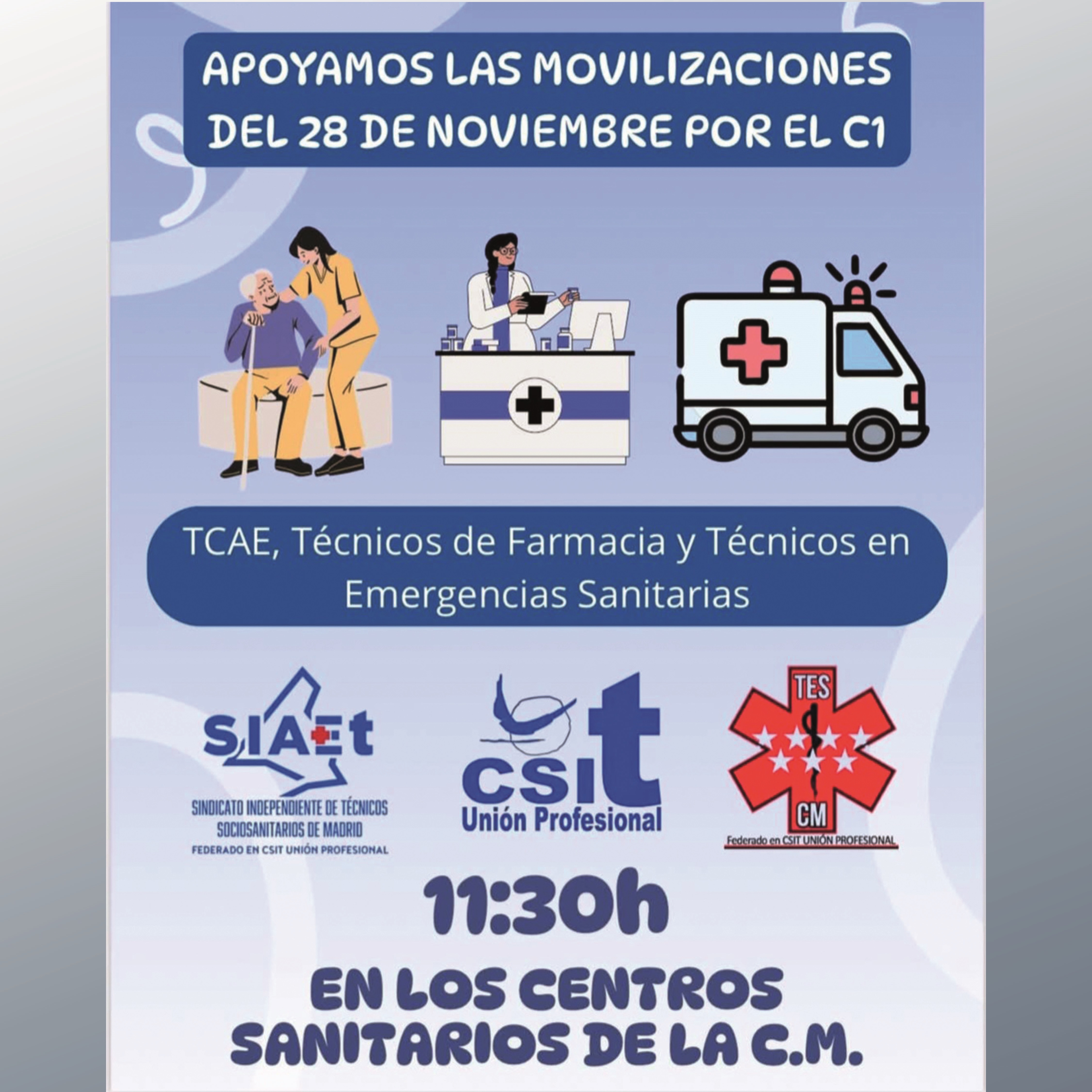 El Sindicato Independiente de Técnicos Sanitarios y Sociosanitarios de Madrid (SIAET) y el Sindicato de Técnicos en Emergencias Sanitarias de Madrid (TESCM), ambos federados en CSIT UNIÓN PROFESIONAL, manifiestan públicamente su apoyo al conjunto de acciones convocadas para el 28 de noviembre de 2025 —concentraciones en los centros sanitarios de la Comunidad de Madrid, manifestaciones y demás movilizaciones— en defensa de una reivindicación tan justa como urgente: la clasificación en el grupo C1 para los Técnicos en Cuidados de Enfermería, Técnicos en Farmacia y Técnicos en Emergencias Sanitarias.
