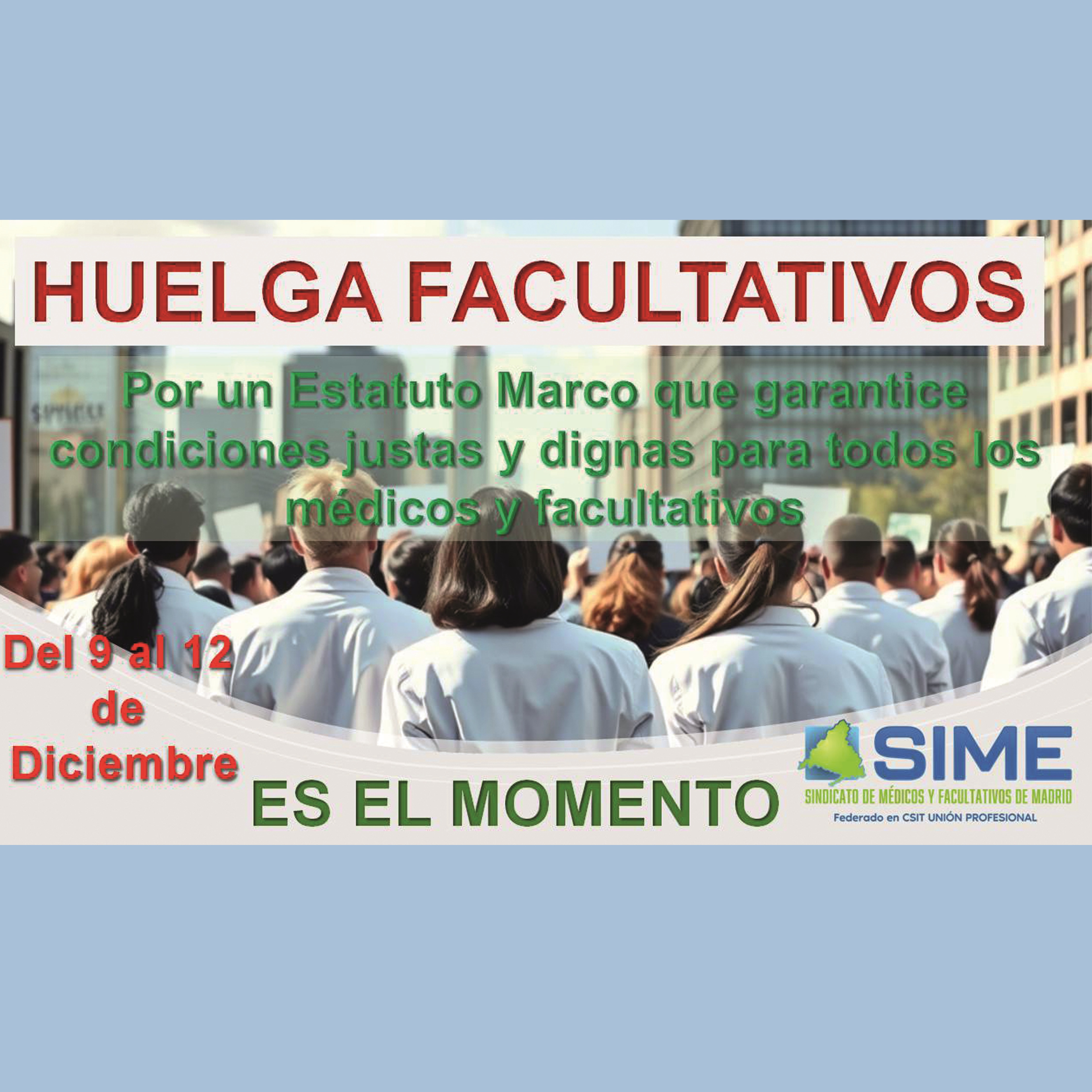 Desde el Sindicato de Médicos y Facultativos de Madrid (SIME), federado en CSIT UNIÓN PROFESIONAL, junto con el resto de organizaciones que constituimos la Agrupación Profesional por un Estatuto Médico y Facultativo (APEMYF), convocamos las jornadas de huelga del personal facultativo del sistema público de salud, que tendrán lugar los días 9, 10, 11 y 12 de diciembre, coincidiendo con el paro médico que han convocado ese mismo día diferentes organizaciones sindicales del Estado.
