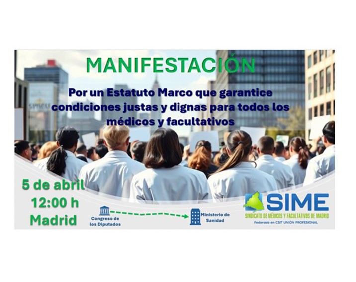 Desde SIME, Sindicato de Médicos y Facultativos de Madrid, federado en CSIT UNIÓN PROFESIONAL, recordamos que el sábado, 5 de abril, partiremos en manifestación, desde el Congreso hasta el Ministerio de Sanidad, para exigir un Estatuto Marco que garantice condiciones justas y dignas para todos los médicos y facultativos.