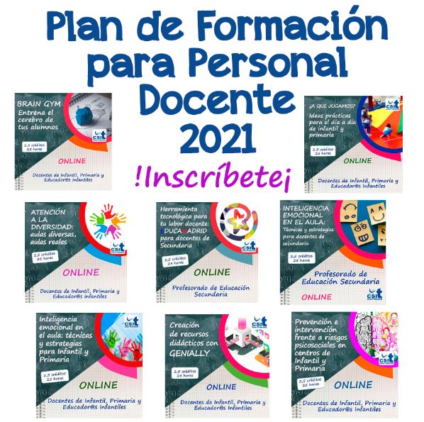 CSIT UNIÓN PROFESIONAL presenta su plan de formación para personal docente, acreditado y orientado a docentes de Infantil y Primaria, Secundaria, así como a Educadores Infantiles, gratuito para afiliados y cuyo coste para los alumnos no afiliados es tan solo de 50€. Consulta nuestros precios especiales para grupos de un mismo centro. En esta segunda edición, ofrecemos nueve cursos cuyos plazos de inscripción finalizan el 1 de octubre o el 8 de noviembre, respectivamente, según sus periodos de impartición, pero el número de plazas es limitado, por lo que te recomendamos que no lo dejes para el final y rellenes el formulario de inscripción en el curso que sea de tu interés, cuanto antes.