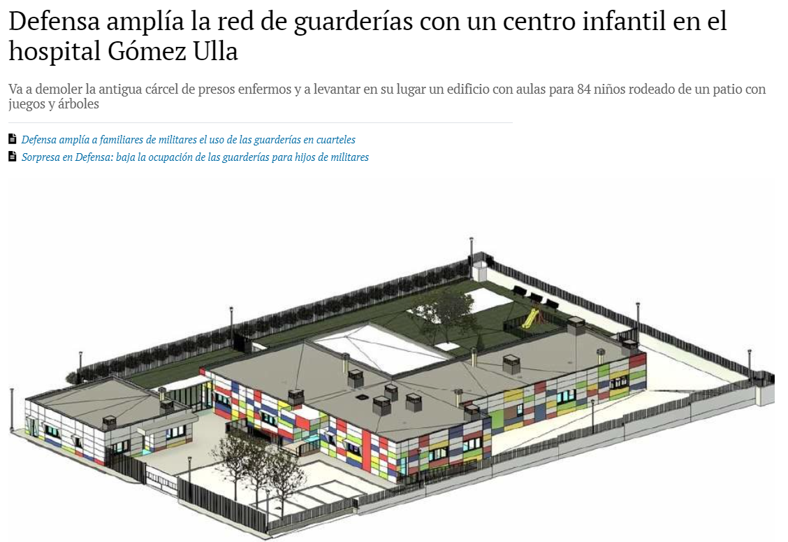 Puedes consultar la información publicada el 26/01/2023, en El Confidencial Digital: "Defensa amplía la red de guarderías con un centro infantil en el Hospital Gómez Ulla".