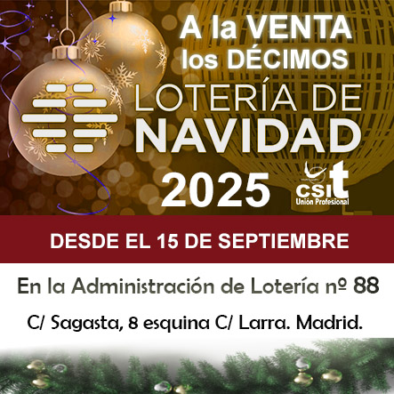 A partir del lunes, día 15 de septiembre, ya puedes adquirir los décimos de la LOTERÍA DE NAVIDAD 2025 de CSIT UNIÓN PROFESIONAL, comprándolos directamente en la Administración de Lotería nº 88, calle Sagasta, 8, esquina con calle Larra, de Madrid.