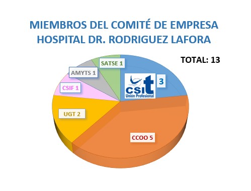 CSIT UNIÓN PROFESIONAL ha obtenido 3 delegados en el Comité de Empresa del Hospital Doctor Rodríguez Lafora. Los 33 votos recibidos, nos confieren casi el 20% de la representatividad.